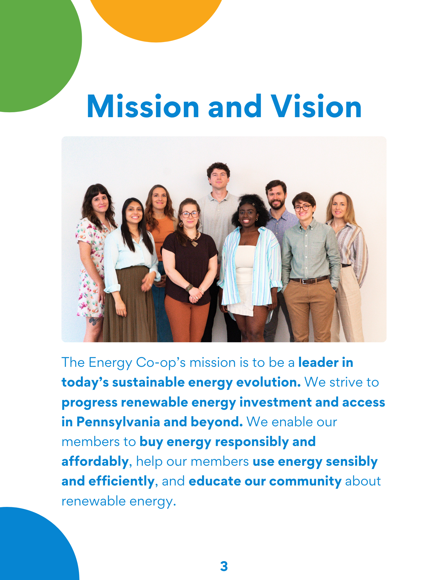 The Energy Co-op’s mission is to be a leader in today’s sustainable energy evolution. We strive to progress renewable energy investment and access in Pennsylvania and beyond. We enable our members to buy energy responsibly and affordably, help our members use energy sensibly and efficiently, and educate our community about renewable energy. Read our 2024 Impact Report below, to learn how much our cooperative reduced our collective carbon footprint and how we continue to lead today’s sustainable energy evolution through educational initiatives and community partnerships.