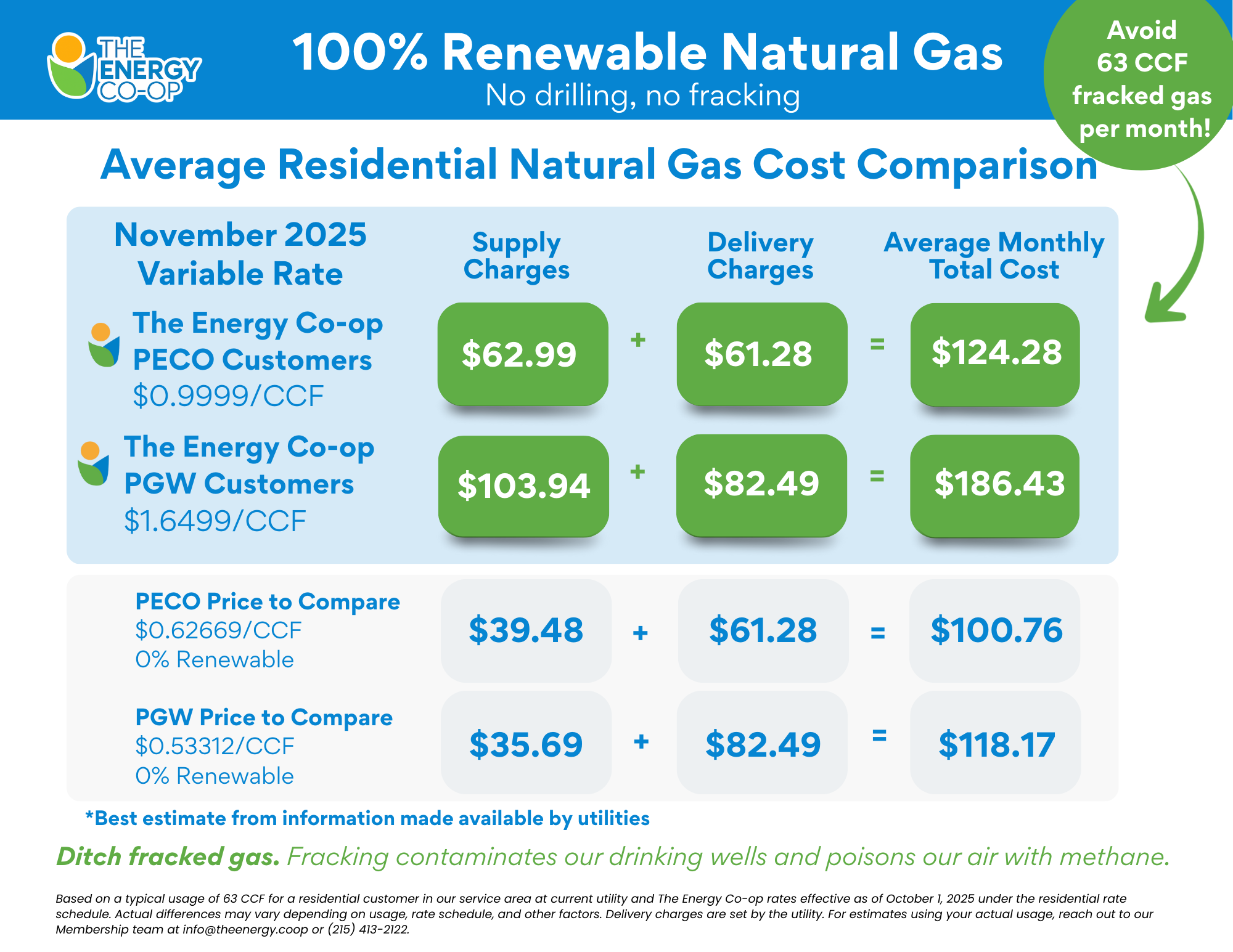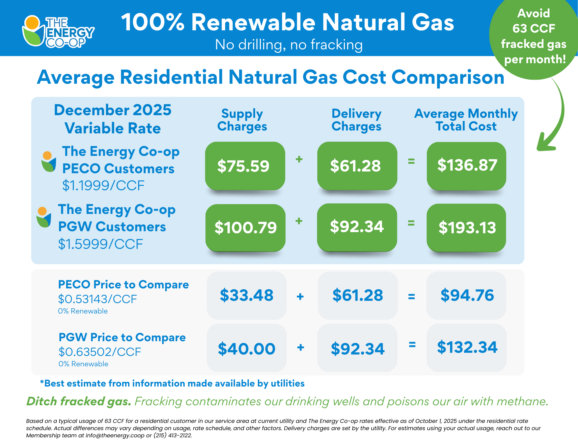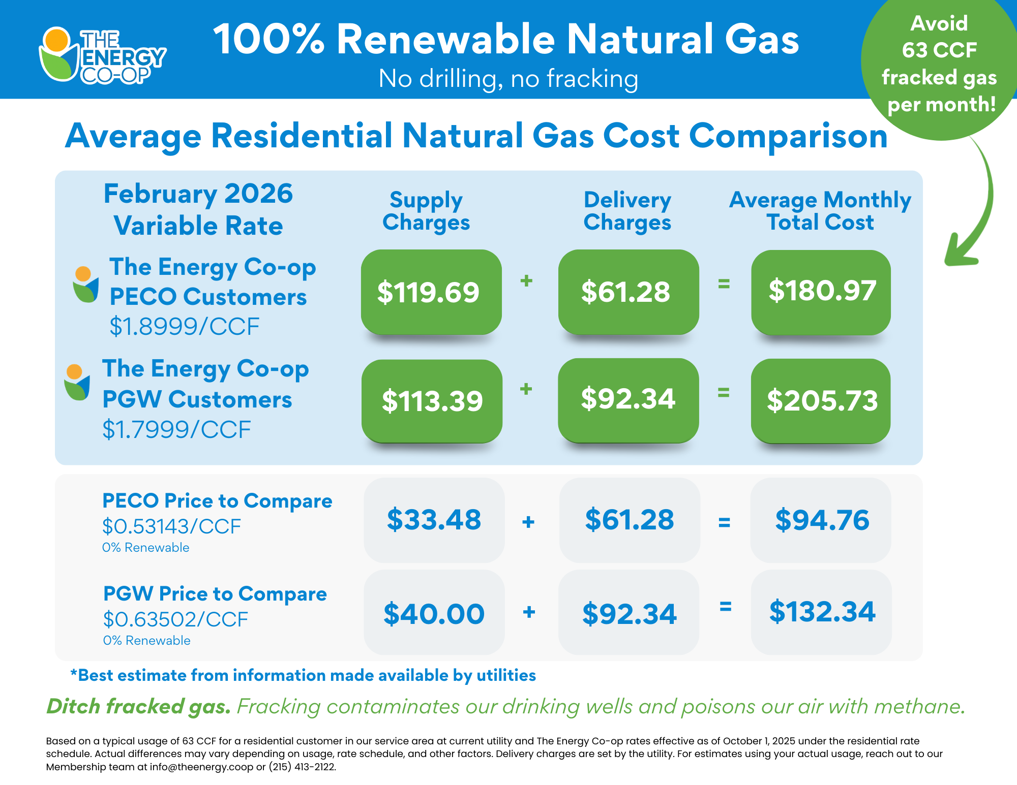 When you enroll in The Energy Co-op’s RNG program, there is no interruption in your gas service. Your utility will continue to deliver gas to your home or business and bill you for it, just as it does now. The only difference is, you will join other Pennsylvanians who are not only concerned about drilling and fracking in our state, but are doing something about it.