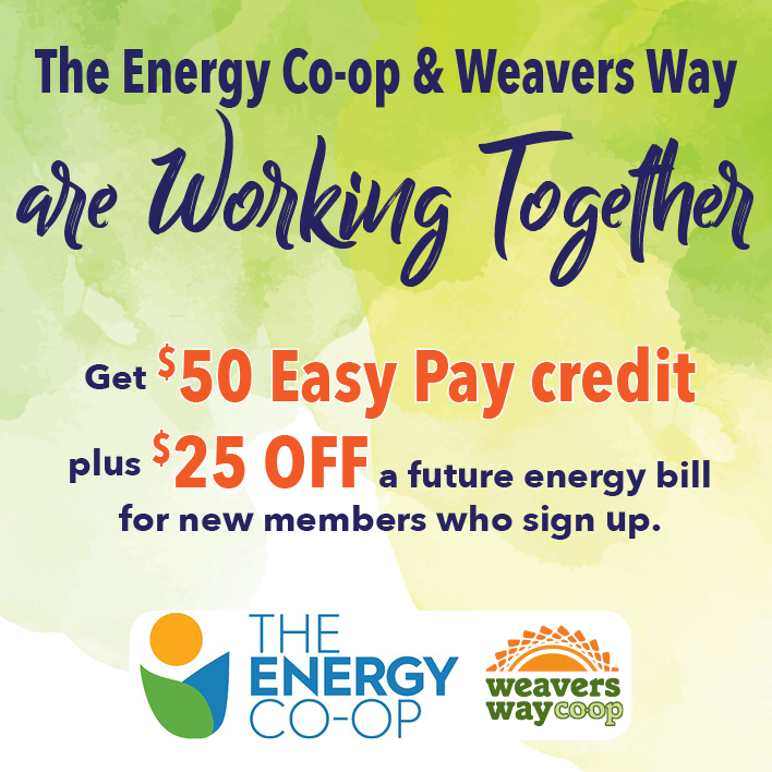 Existing Members of The Energy Co-op who join Weavers Way can receive a $50 Weavers Way Easy Pay credit and $25 off a future energy bill by submitting a member application, then emailing member@weaversway.coop with your new member ID number to receive EasyPay credit.**